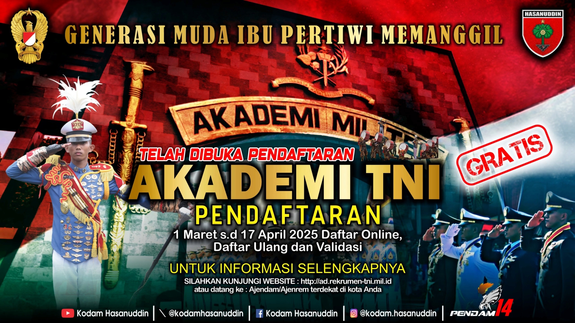 Bagi Putra Terbaik Bangsa Yang ingin Mengabdikan diri Sebagai Perwira TNI, Saatnya Bergabung! Pendaftaran dibuka mulai 3 Maret – 17 April 2025 dengan pendidikan selama 4 tahun. Untuk informasi Selengkapnya Silahkan Kunjungi Website : 🔗 Daftar online di: https://rekrutmen-tni.mil.id Atau datang ke : Ajendam/Ajenrem terdekat di kota Anda Jadilah bagian dari Akademi TNI dan wujudkan impian menjadi perwira masa depan! 🇮🇩🔥